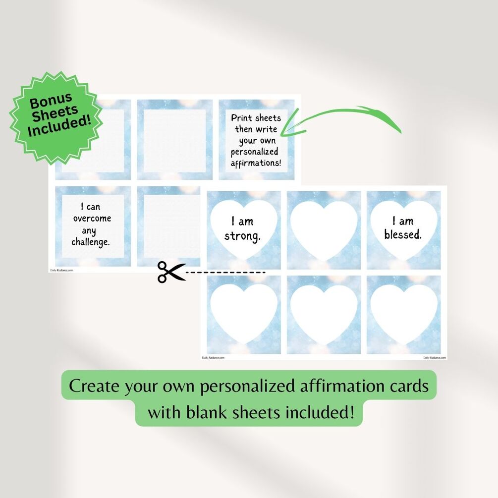 60 Printable Affirmation Cards. 6 Cards on Each Page. - 10 Pages Each affirmation card is 3.0625 X 2.875 inches Bonus #1: 2 Free Printable Blank Affirmation Card Sheets - Write your own personalized/customized affirmations Bonus #2: Digital Download Freebie - 111 Ideas for Happiness PDF Book Bonus #3 3 Positive Manifestation Worksheets
