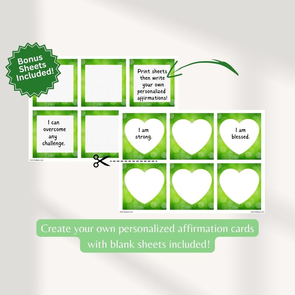60 Printable Affirmation Cards. 6 Cards on Each Page. - 10 Pages Each affirmation card is 3.0625 X 2.875 inches Bonus #1: 2 Free Printable Blank Affirmation Card Sheets - Write your own personalized/customized affirmations Bonus #2: Digital Download Freebie - 111 Ideas for Happiness PDF Book Bonus #3 3 Positive Manifestation Worksheets